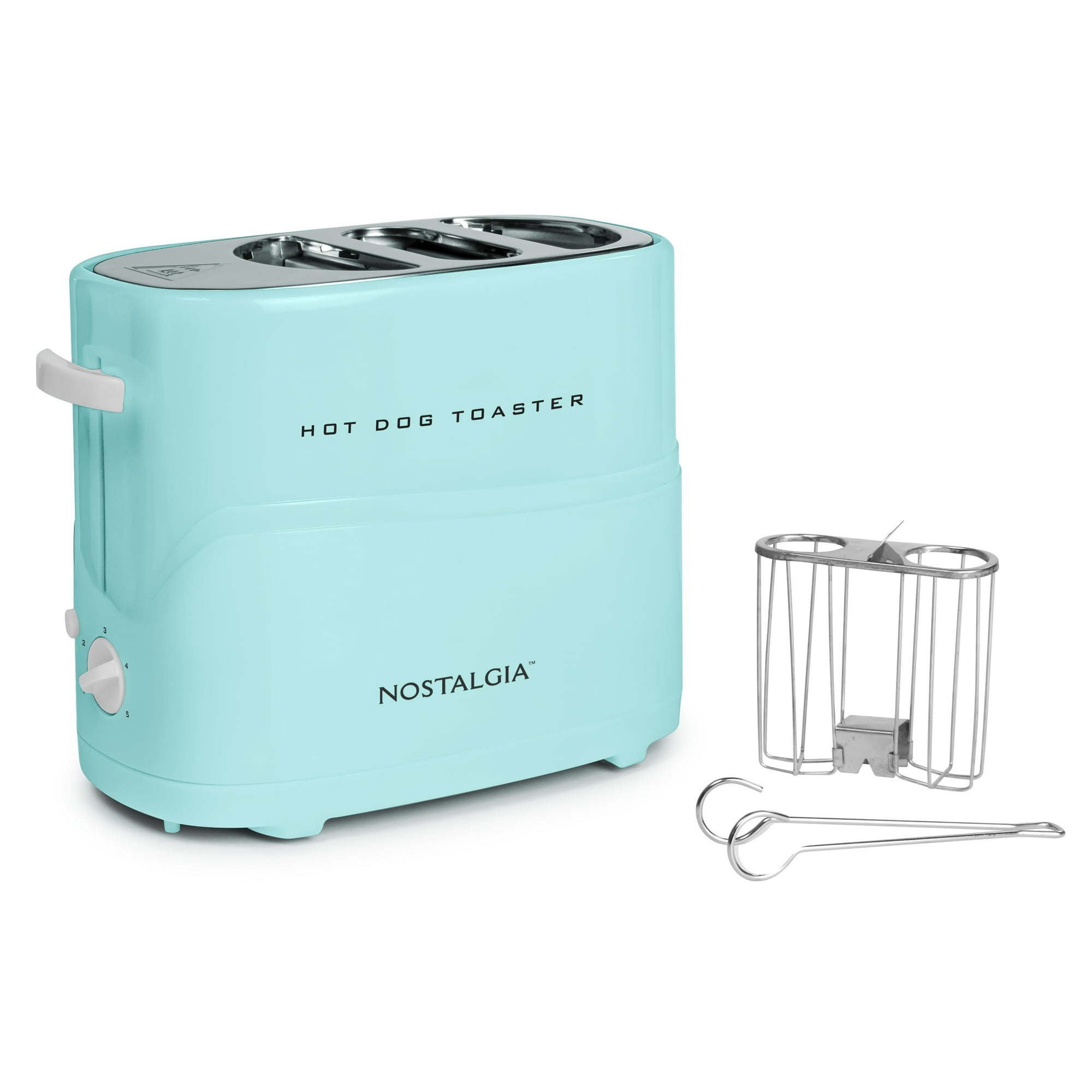 The Nostalgia NHDT600AQ6A Retro Classic 2 Slot Hot Dog and Bun Toaster with mini tongs is the perfect additions to your kitchen appliance collection. The Nostalgia Hot Dog Toaster is great for entertaining and as a fast meal solution for the whole family. This hot dog toaster can toast up to two of your favorite regular-size or extra-plump hot dogs and two hotdog buns at the same time. It has adjustable settings for toasting timer and stop toasting button that allow you to toast your hot dogs to your preferred doneness. The included mini tongs and hot dog cage keep hands safe when removing hot dogs from this appliance, while the drip tray slides out easily after use for easy cleaning. The cord wrap on the bottom side of this hot dog cooker also helps with tidy storage.