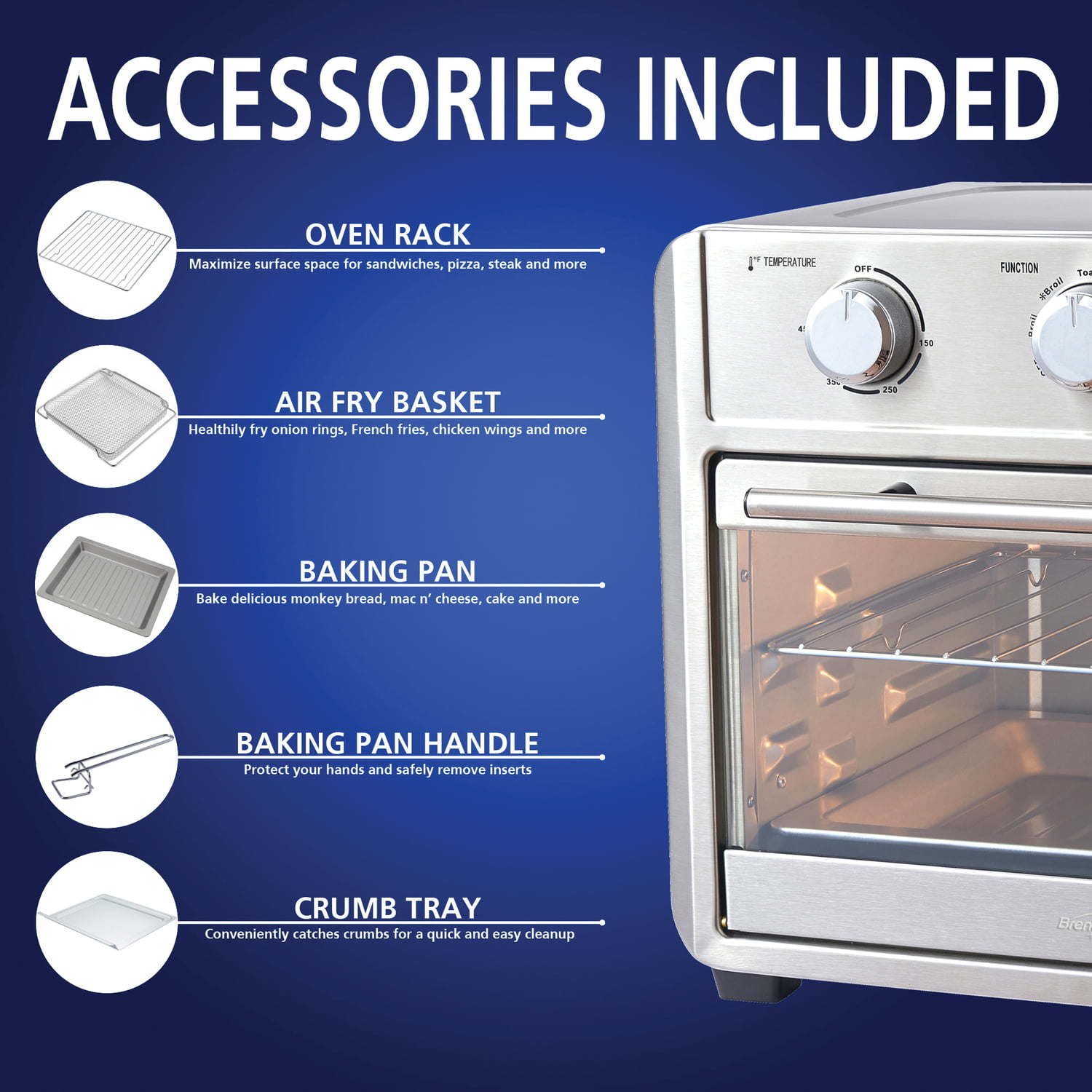 Includes baking sheet, oven rack, frying basket, crumb tray, tray handle, and instruction manual