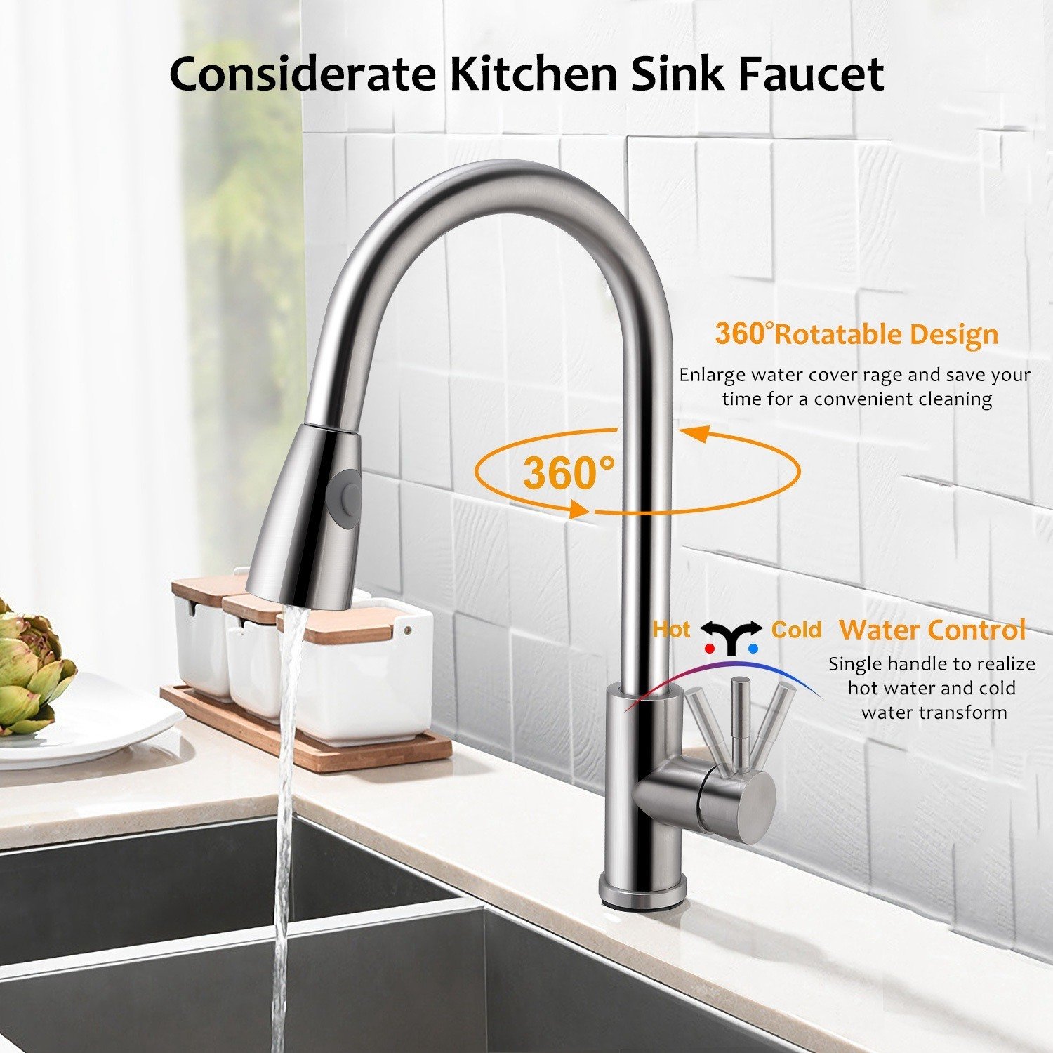 **360°Rotatable Design*:Adopting 360°rotatable pulldown neck and built-in a flexible pullout pipe(can pull out to approx.23.6in) to enlarge water cover range and save your time for a convenient cleaning.